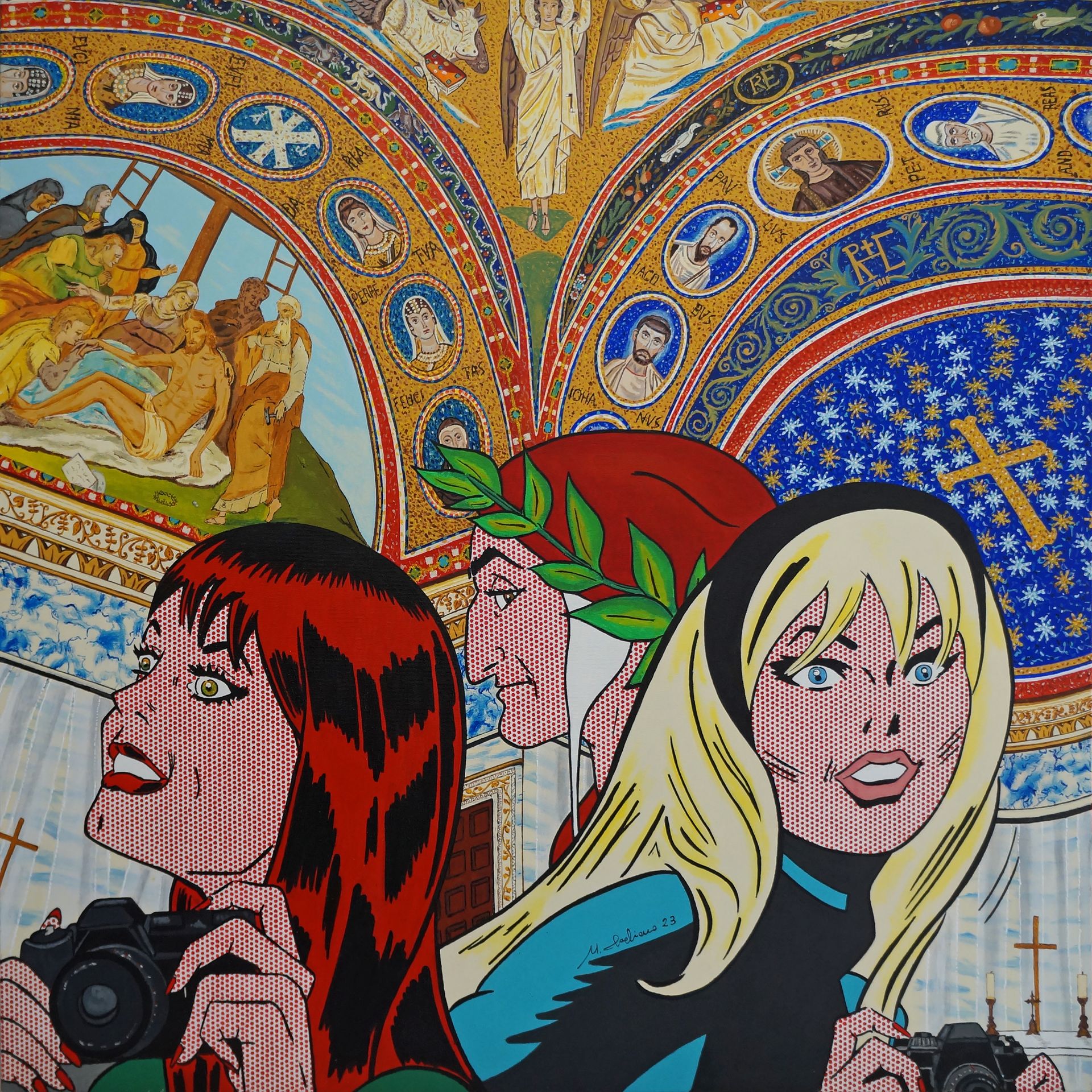 J'ai donc créé une contextualisation de ses personnages illustrés, « réinsérés » dans des lieux et des merveilles de villes italiennes comme Ravenne et ses mosaïques dans la chapelle de l'archevêque, la cathédrale de Monza, la collégiale de la via Etnea à Catane ou dans des réalités représentatives du « Made in Italy » comme la pizza, le carnaval de Venise ou la renaissance d'Alitalia en 1969.