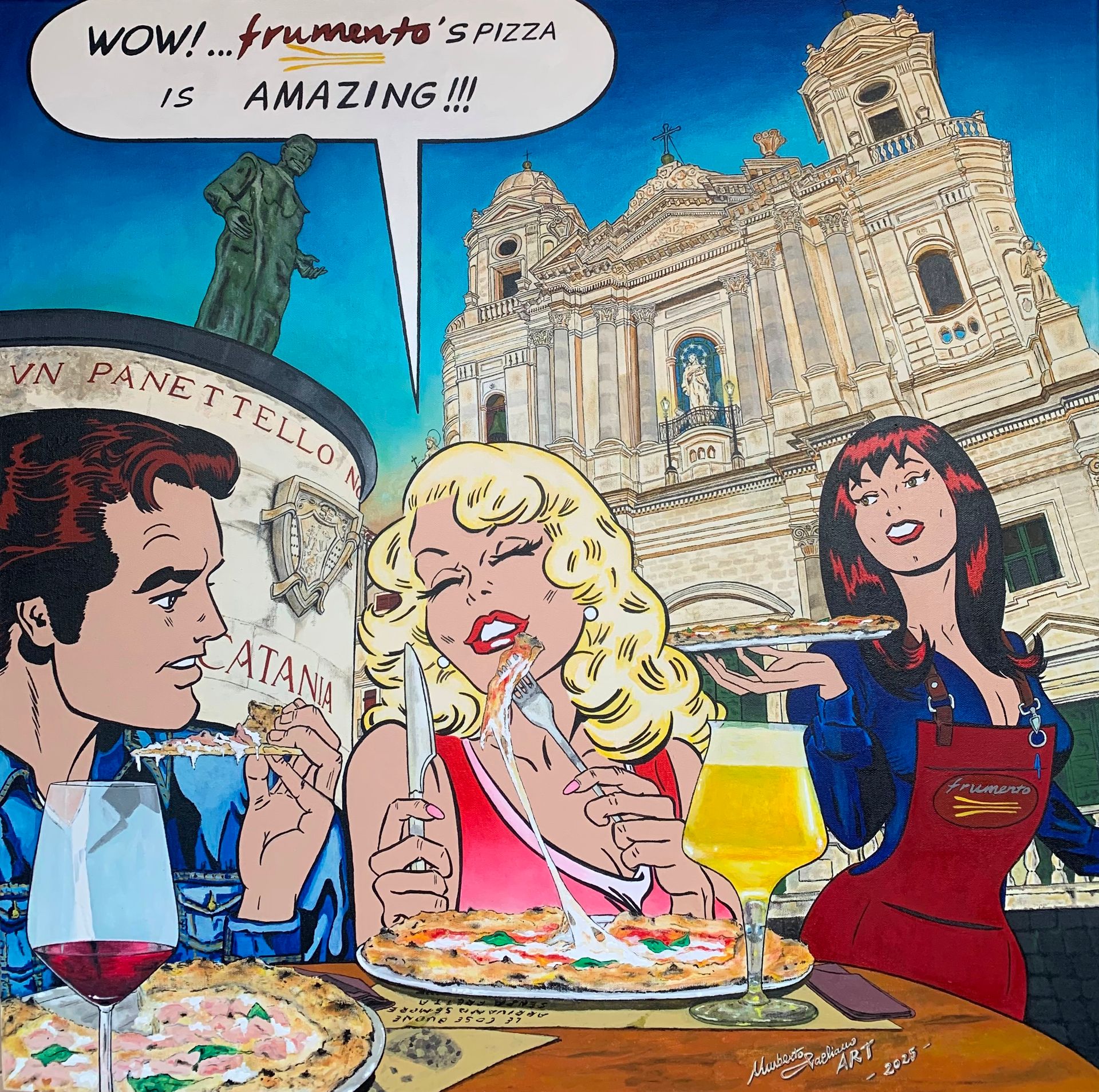 因此,我为他笔下的人物赋予了新的语境,将他们“重新设定”在意大利城市的景点和奇观中,例如拉文纳及其大主教礼拜堂的马赛克、蒙扎大教堂、卡塔尼亚埃特纳大街的圣殿,或者代表“意大利制造”的现实,例如披萨、威尼斯狂欢节或1969年意大利航空的重生。