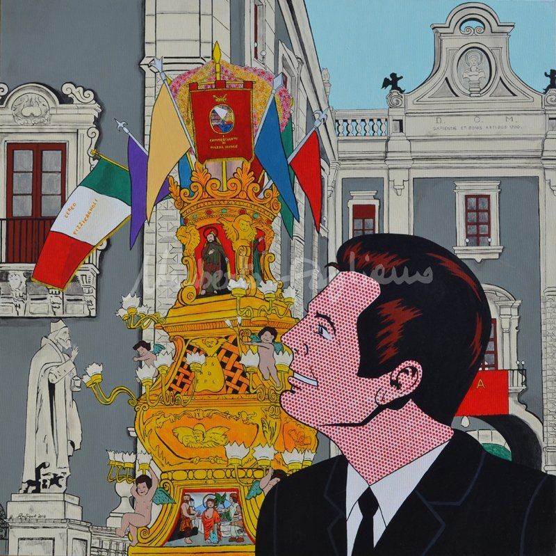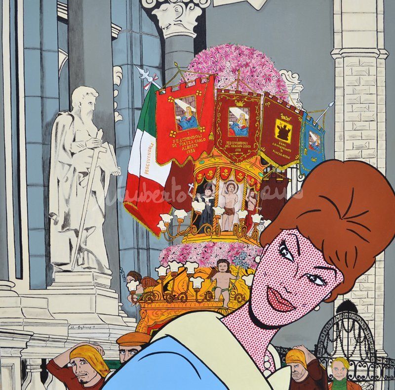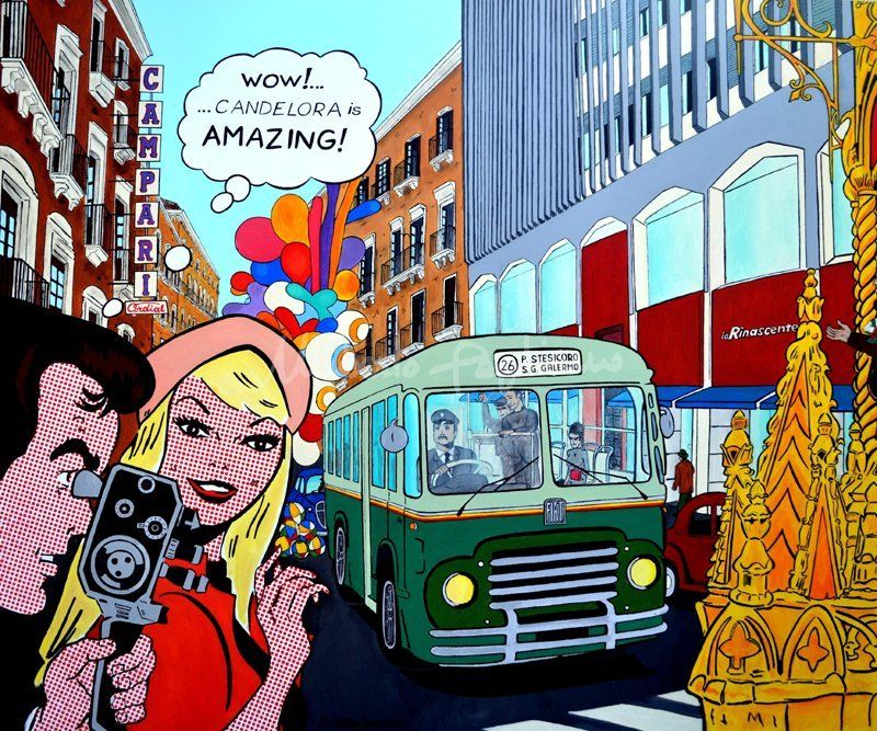 这位艺术家受到美国波普艺术代表人物“罗伊·利希滕斯坦”(Roy Lichtenstein)等作家的影响,运用“本戴”(Ben-Day)点画技法,创作了“VIVA S.AGATA - CATANIA IN POP-ART”系列作品,将漫画中或多或少为人知的面孔与他居住地区的场景“混搭”在一起。