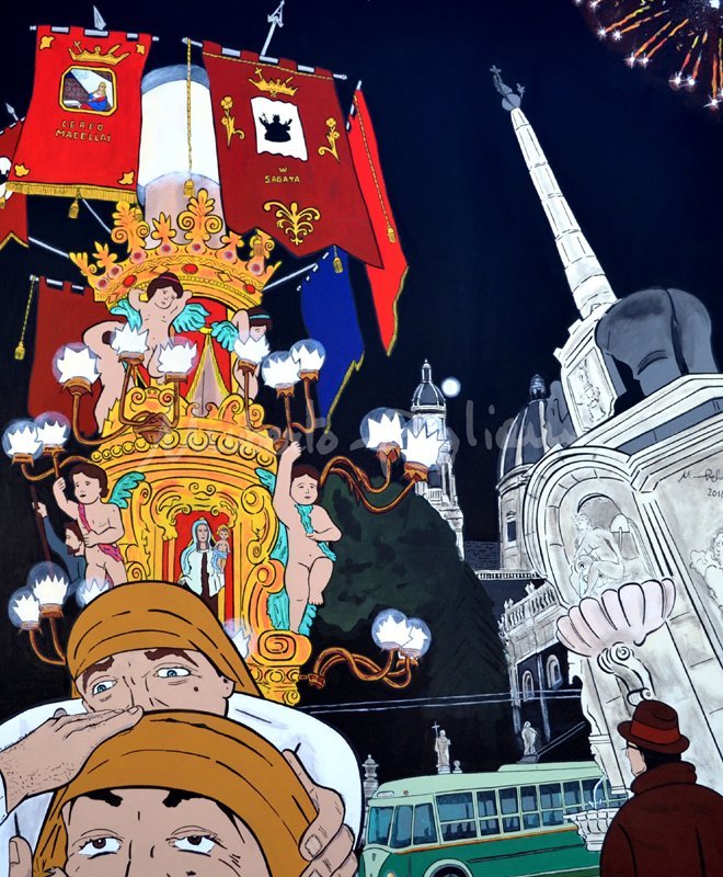 《圣阿加塔万岁》是该项目中的一件艺术作品,长6米,高1米。我描绘了圣阿加塔遗骸的游行场景,遗骸被放置在由信徒用两根长绳拉动的铁架上。在信徒之中,你可以看到一些西西里名人的面孔,例如莱昂纳多·夏夏和安德烈亚·卡米莱里。